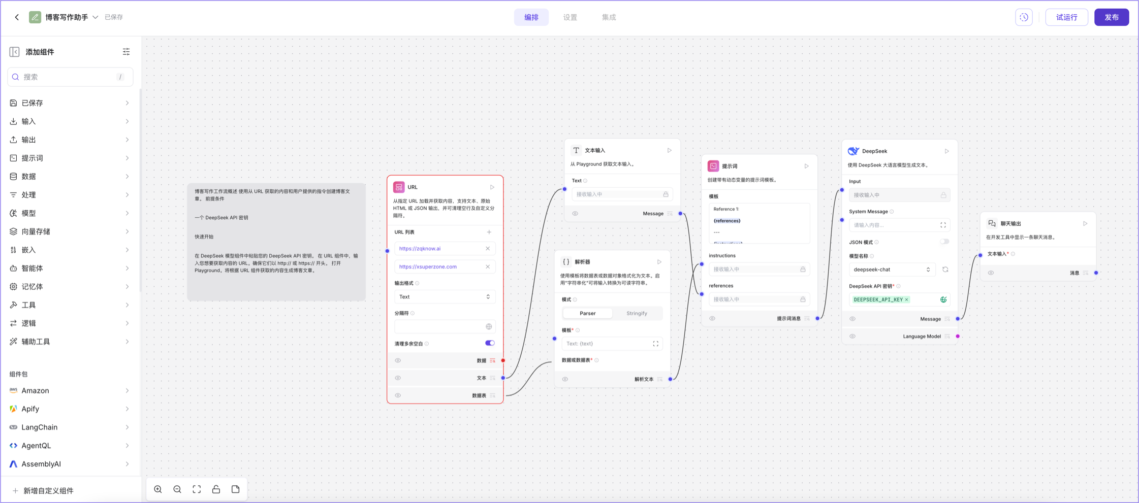 这个流程创建了一个博客文章生成器,包含 提示词、OpenAI 和 文本输出 组件,并通过 URL 和 文本输入 组件增加了参考内容和指令。