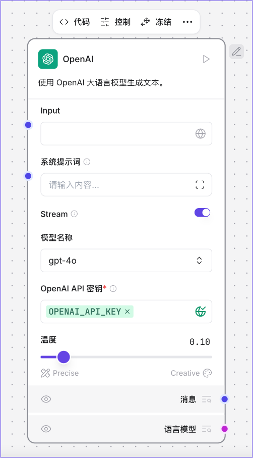 输入定义: 每个输入(如IntInput或DataInput)指定输入的类型、名称和显示属性,这些在组件的 UI 面板中显示为可配置字段。