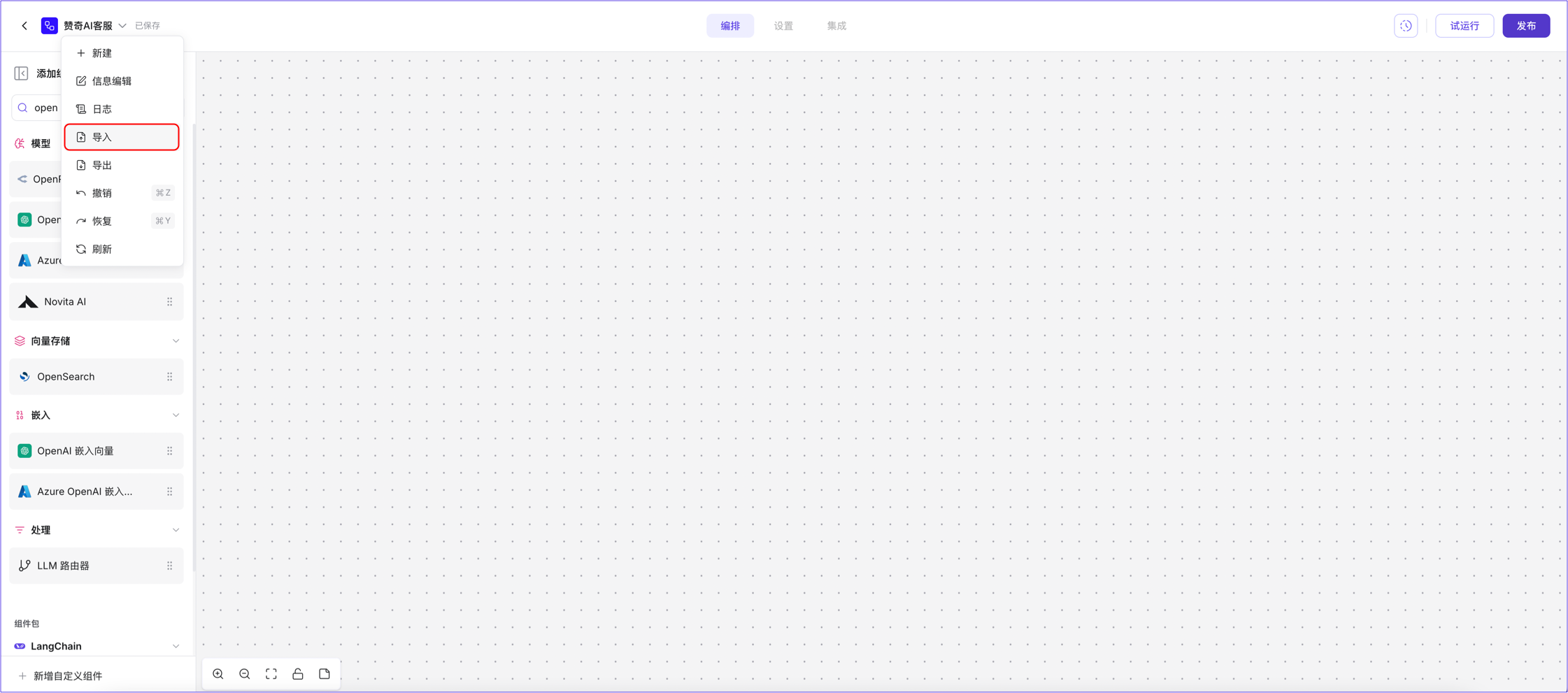 如果您已经有 Blaflow JSON 文件,可以通过点击项目名称并选择导入将其导入到 Blaflow 中。